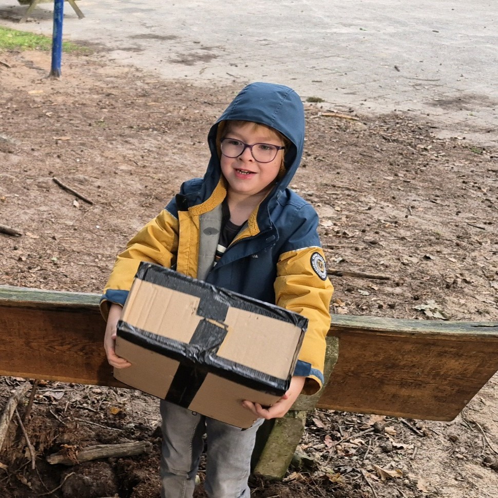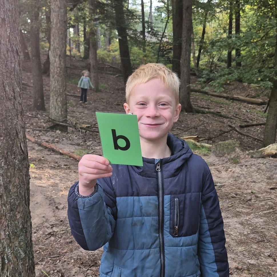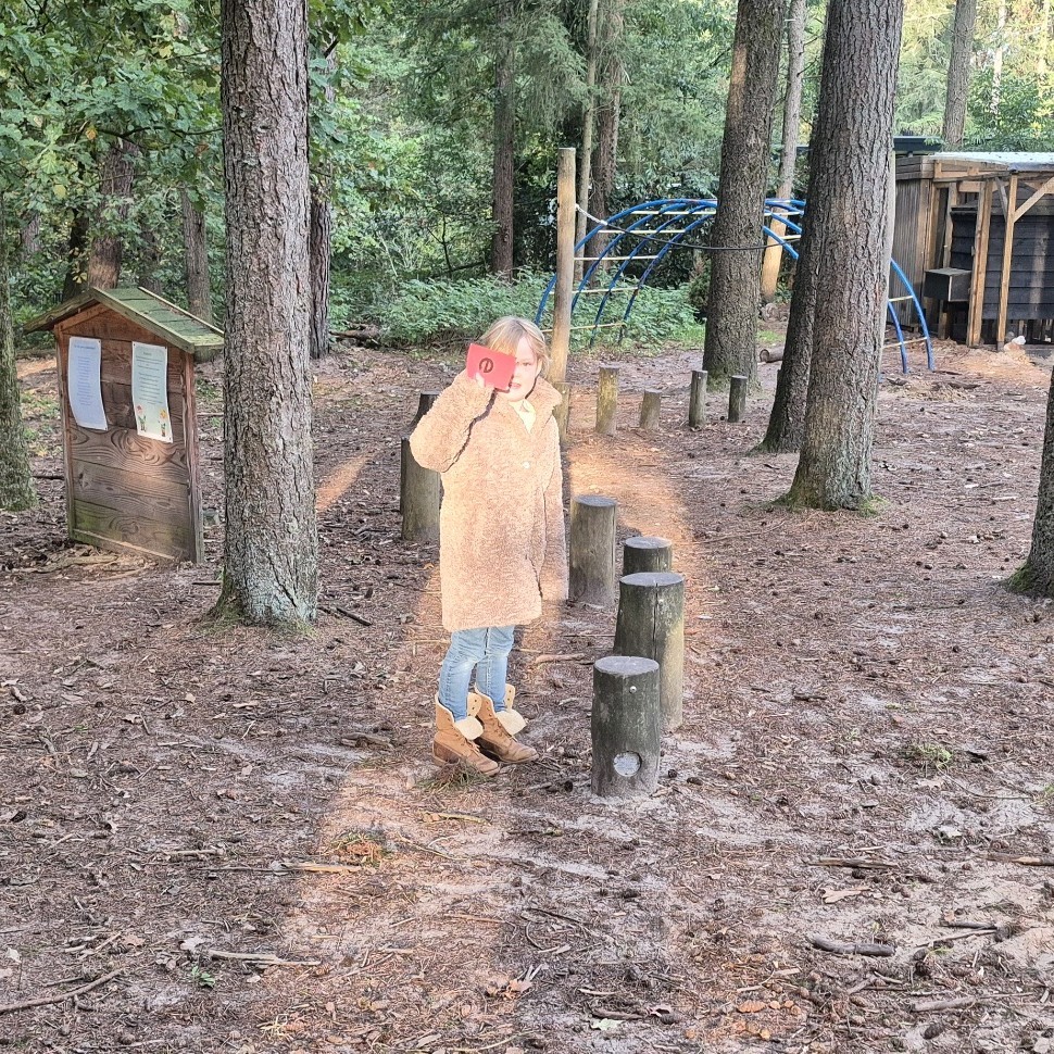 We kregen een grote envelop met een poster erin. Op de poster stond: zoek de letters in het bos!